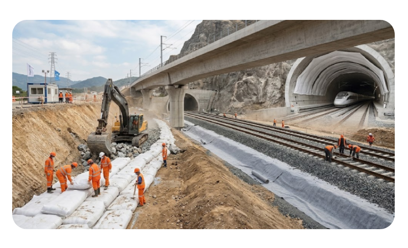 By leveraging fully automated production lines, VEE KAY INTERNATIONAL ensures unmatched product uniformity and consistent quality across all GSM ranges. Our reliable geosynthetic solutions are trusted globally for reinforcing railways, lining tunnels, and stabilizing complex terrains.